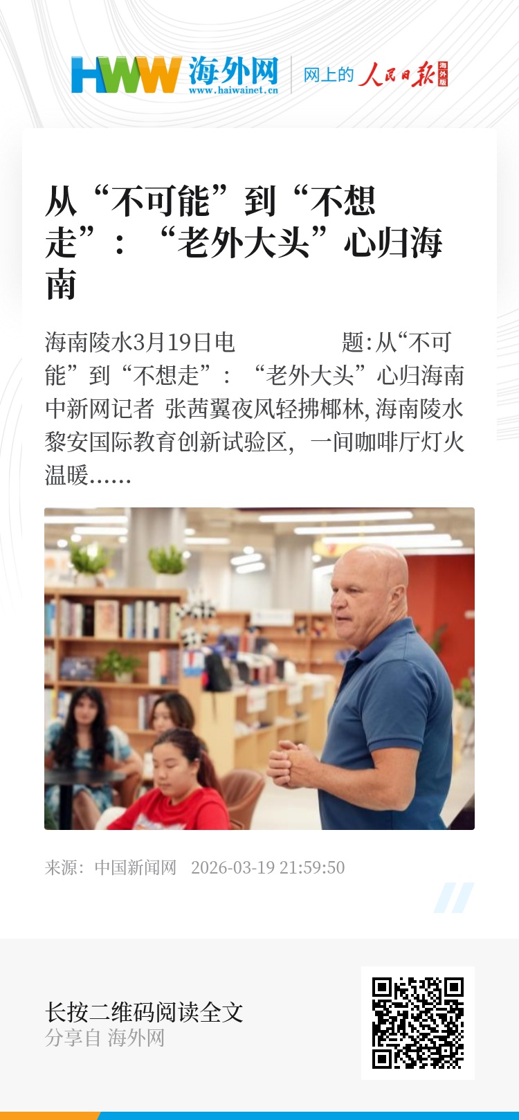 中新网海南陵水3月19日电 题:从“不可能”到“不想走”:“老外大头”心归海南