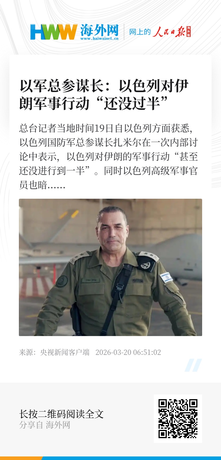 总台记者当地时间19日自以色列方面获悉,以色列国防军总参谋长扎米尔在一次内部讨论中表示,以色列对伊朗的军事行动“甚至还没进行到一半”。同时以色列高级军事官员也暗示,目前还没有结束这场战争的时间表。