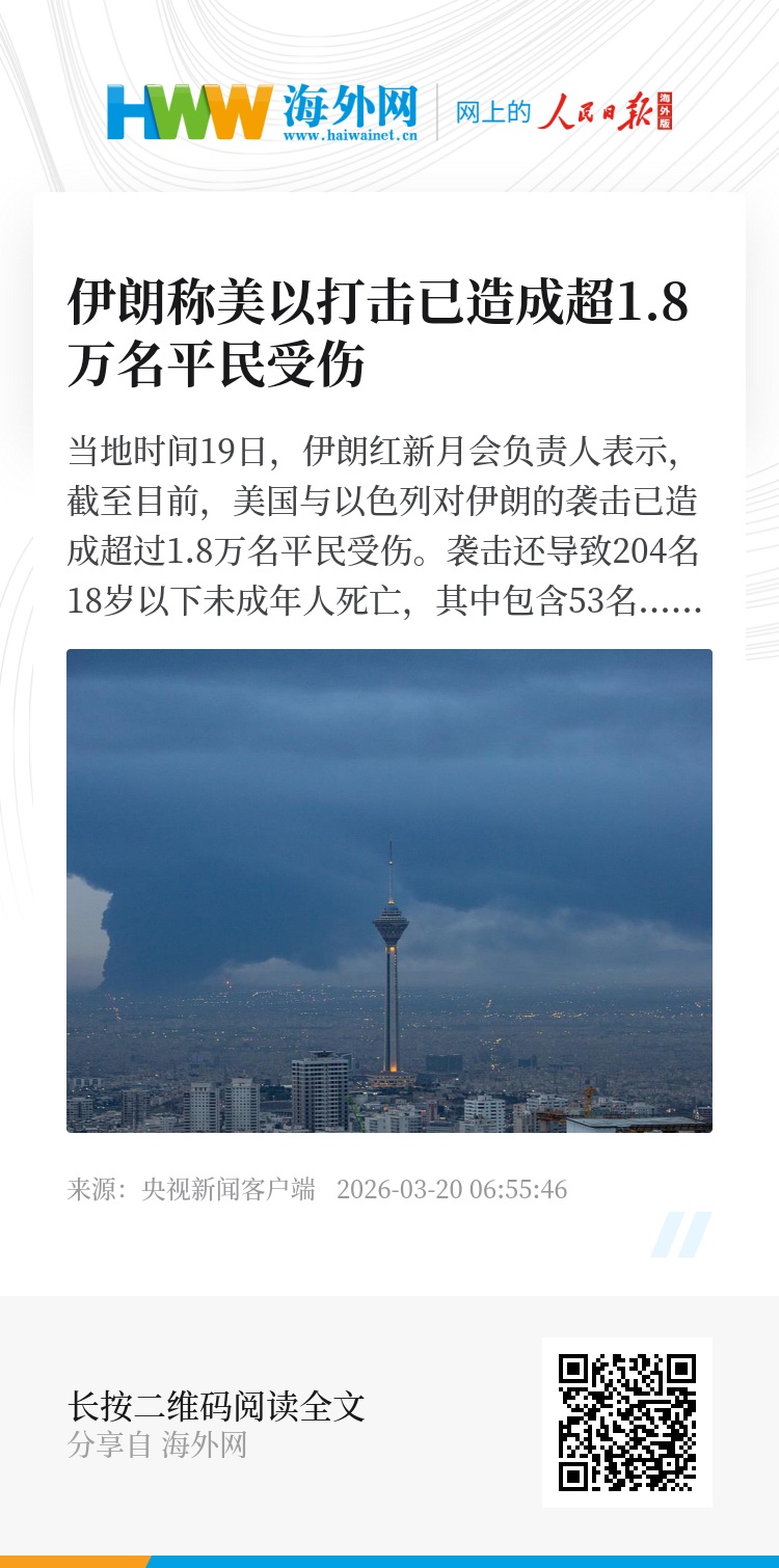 当地时间19日,伊朗红新月会负责人表示,截至目前,美国与以色列对伊朗的袭击已造成超过1.8万名平民受伤。袭击还导致204名18岁以下未成年人死亡,其中包含53名5岁以下的儿童。