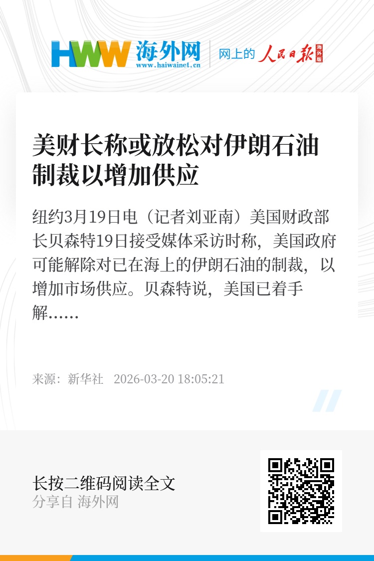 新华社纽约3月19日电(记者刘亚南)美国财政部长贝森特19日接受媒体采访时称,美国政府可能解除对已在海上的伊朗石油的制裁,以增加市场供应。