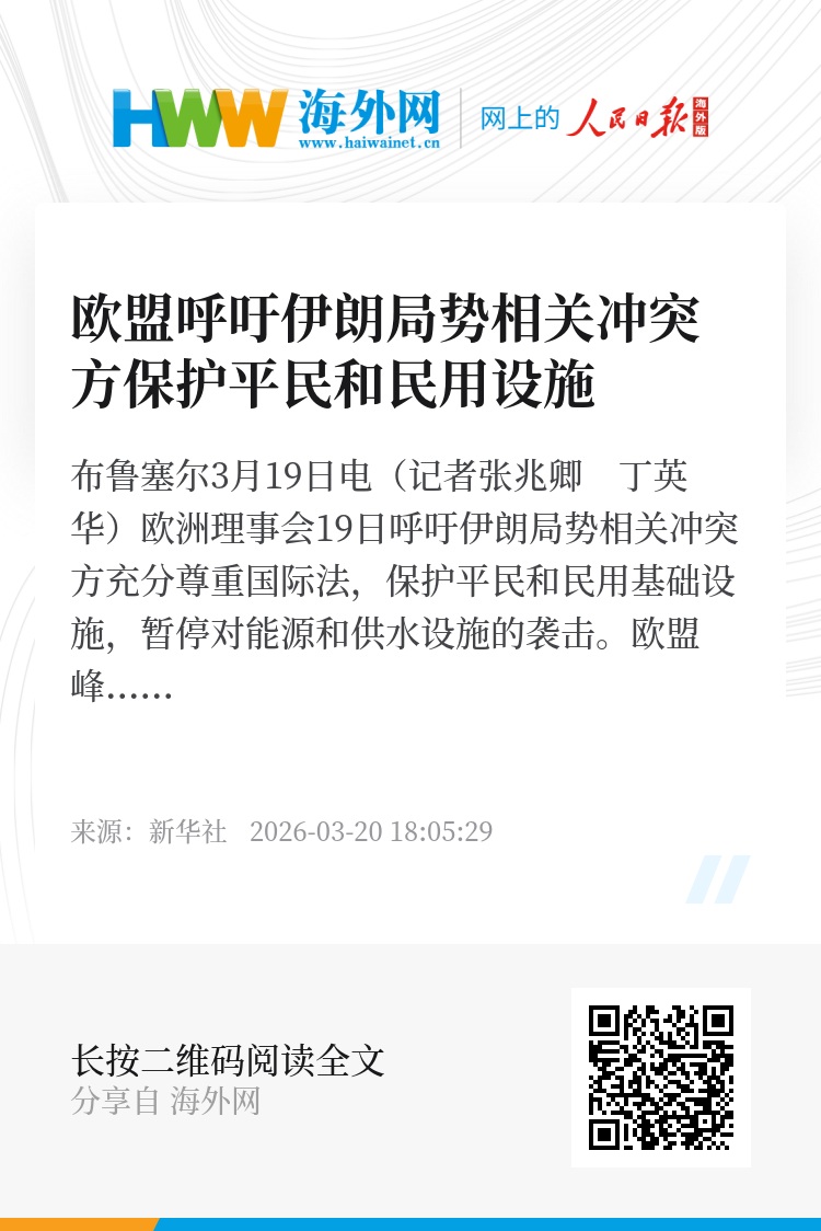 新华社布鲁塞尔3月19日电(记者张兆卿 丁英华)欧洲理事会19日呼吁伊朗局势相关冲突方充分尊重国际法,保护平民和民用基础设施,暂停对能源和供水设施的袭击。