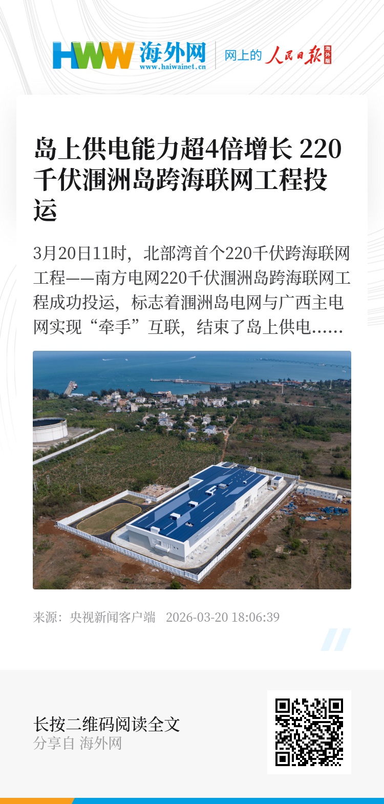 3月20日11时,北部湾首个220千伏跨海联网工程——南方电网220千伏涠洲岛跨海联网工程成功投运,标志着涠洲岛电网与广西主电网实现“牵手”互联,结束了岛上供电“孤网运行”的历史,迈入主电网供电的新阶段。