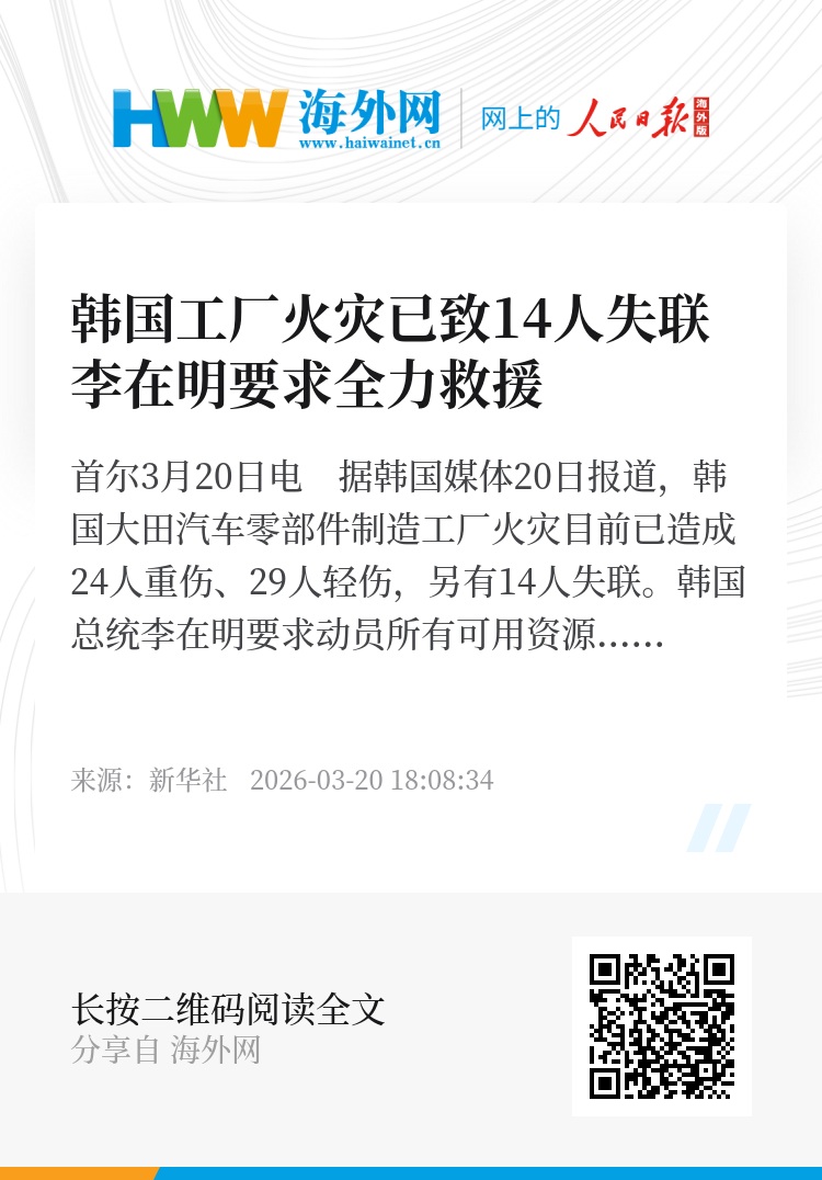 新华社首尔3月20日电 据韩国媒体20日报道,韩国大田汽车零部件制造工厂火灾目前已造成24人重伤、29人轻伤,另有14人失联。韩国总统李在明要求动员所有可用资源,全力开展救援工作。
