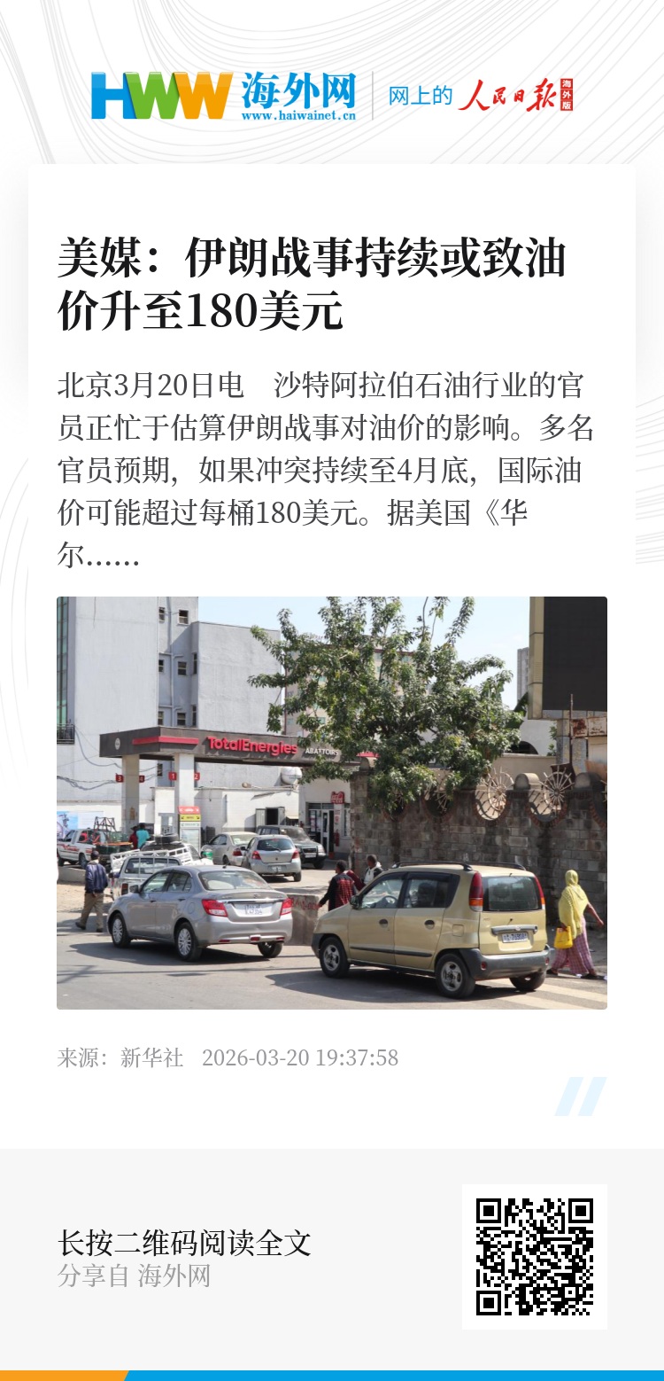 新华社北京3月20日电 沙特阿拉伯石油行业的官员正忙于估算伊朗战事对油价的影响。多名官员预期,如果冲突持续至4月底,国际油价可能超过每桶180美元。
