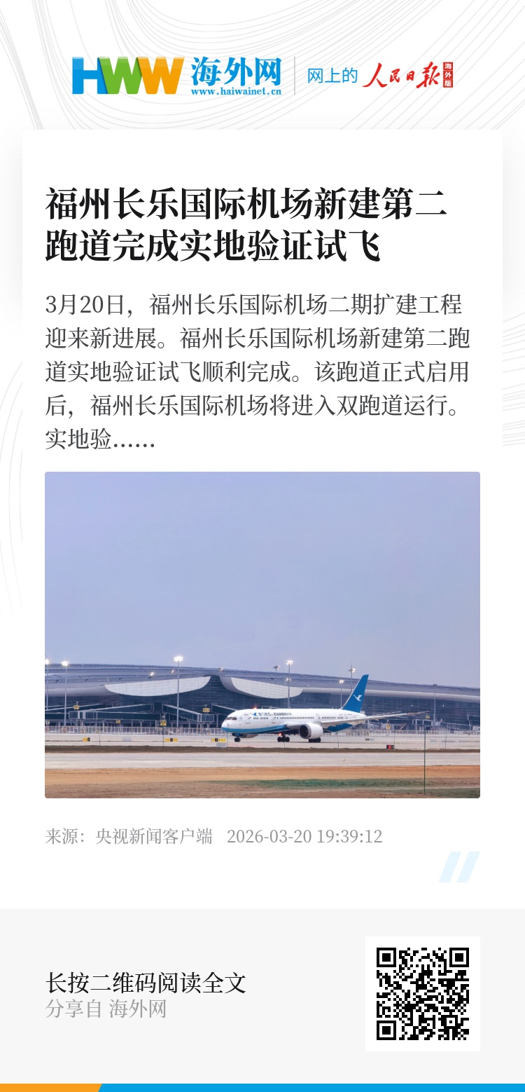 3月20日,福州长乐国际机场二期扩建工程迎来新进展。福州长乐国际机场新建第二跑道实地验证试飞顺利完成。该跑道正式启用后,福州长乐国际机场将进入双跑道运行。