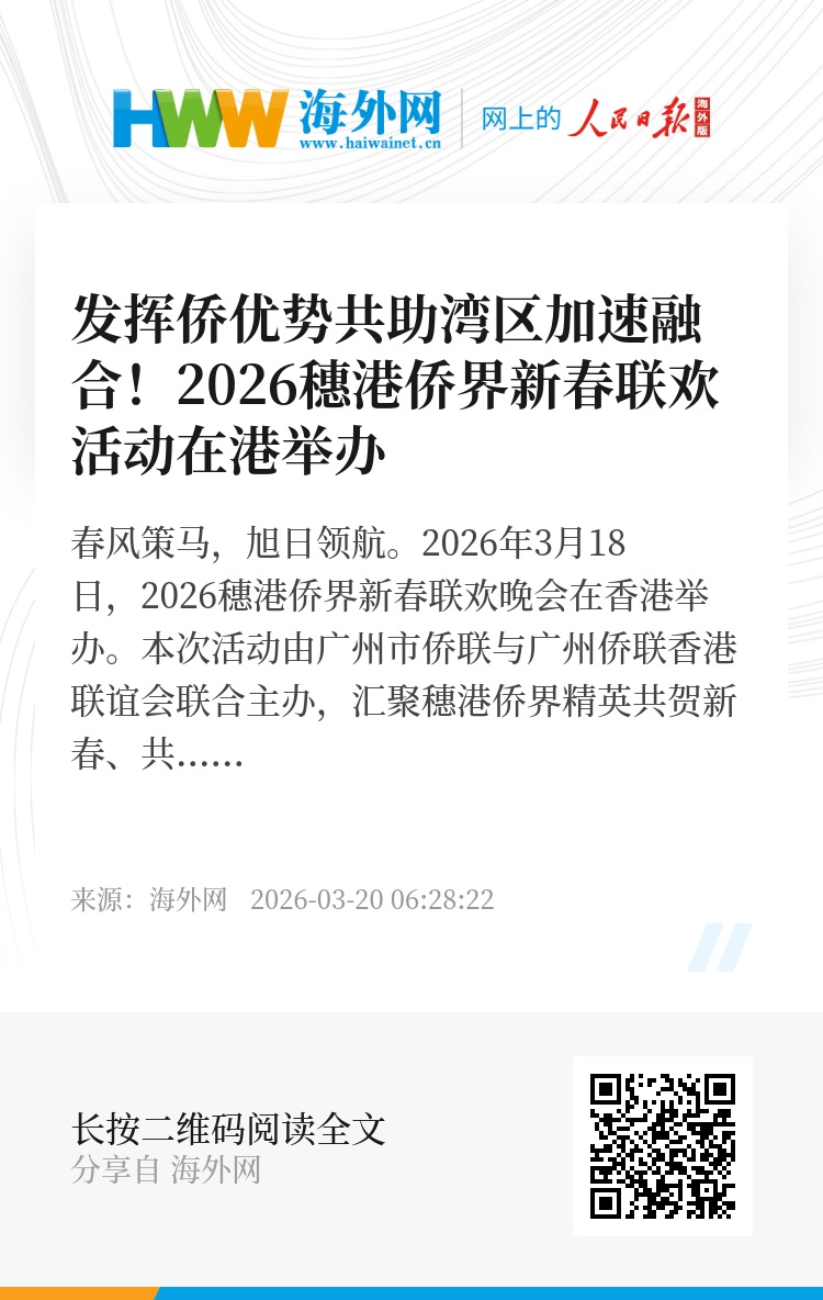 春风策马,旭日领航。2026年3月18日,2026穗港侨界新春联欢晚会在香港举办。本次活动由广州市侨联与广州侨联香港联谊会联合主办,汇聚穗港侨界精英共贺新春、共叙乡情、共商合作,全面展现穗港侨界爱国爱港爱乡、同心聚力大湾区建设的责任与担当。