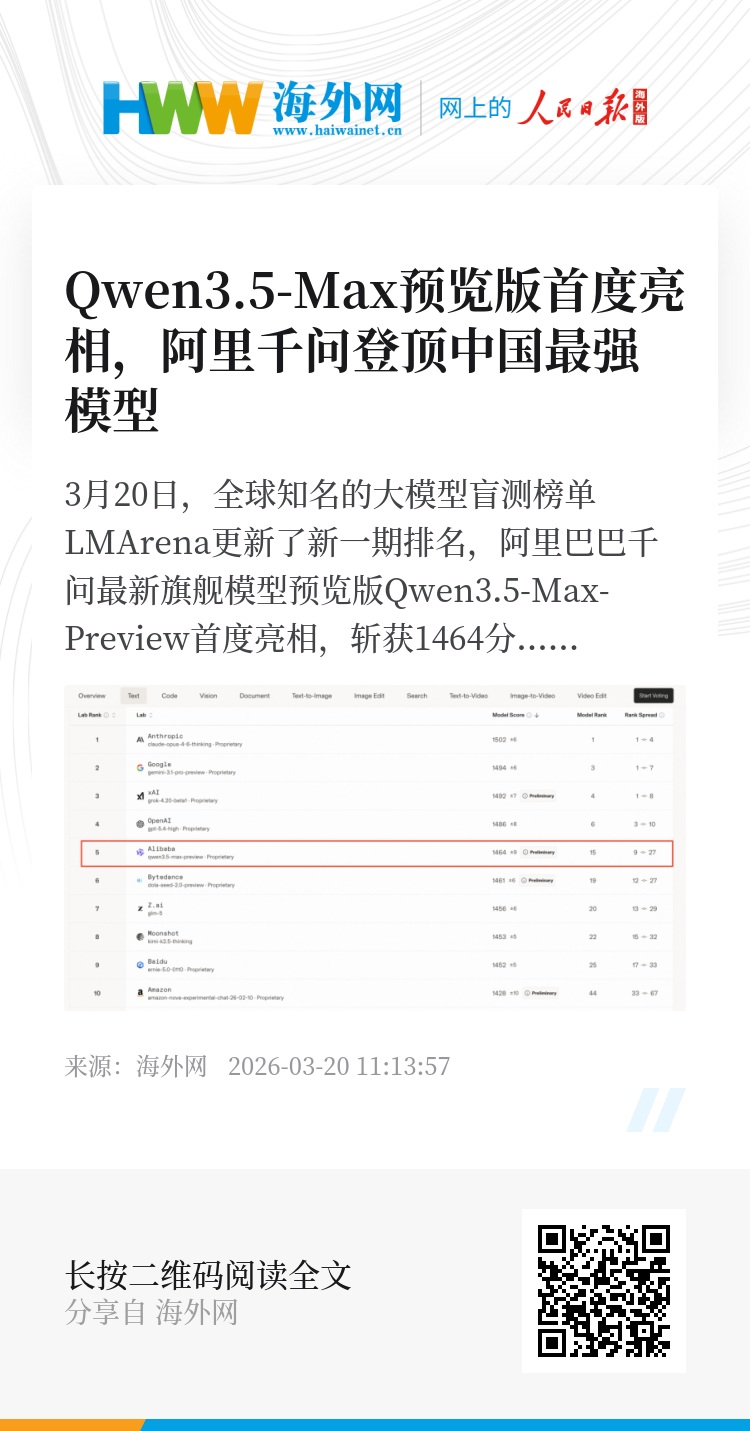 3月20日,全球知名的大模型盲测榜单LMArena更新了新一期排名,阿里巴巴千问最新旗舰模型预览版Qwen3.5-Max-Preview首度亮相,斩获1464分,超过了GPT5.4、Grok4.1等海外顶级模型,以及豆包2.0、GLM5、Kimi2.5等全部国产模型,问鼎中国最强大模型。据了解,千问3.5是阿里于今年除夕发布的最新一代大模型系列,目前已开源0.8B到397B的8款不同尺寸模型,此次亮相的Qwen3.5-Max-Preview是千问3.5系列旗舰模型的预览版,整体性能、专家级文本能力、数学能力均位列中国第一。有消息称,Qwen3.5-Max正式版或将于近期发布,能力还将继续进化升级。
