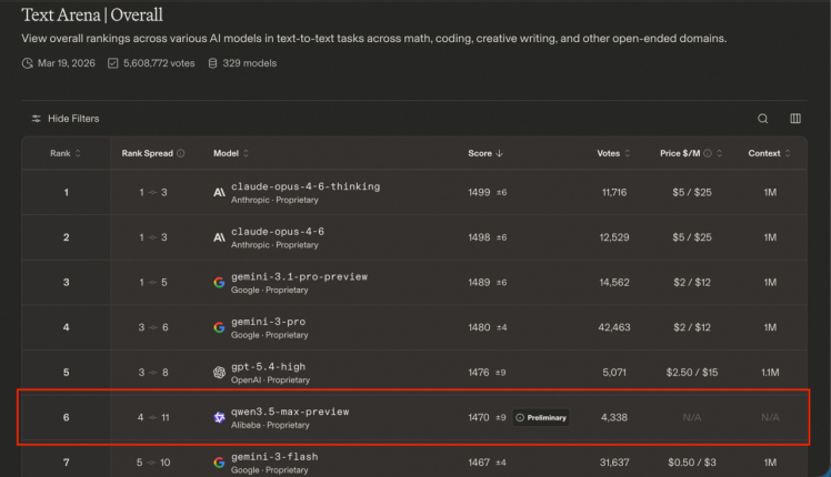 图说:凭借Qwen3.5-Max-Preview,阿里跻身全球前五大模型公司