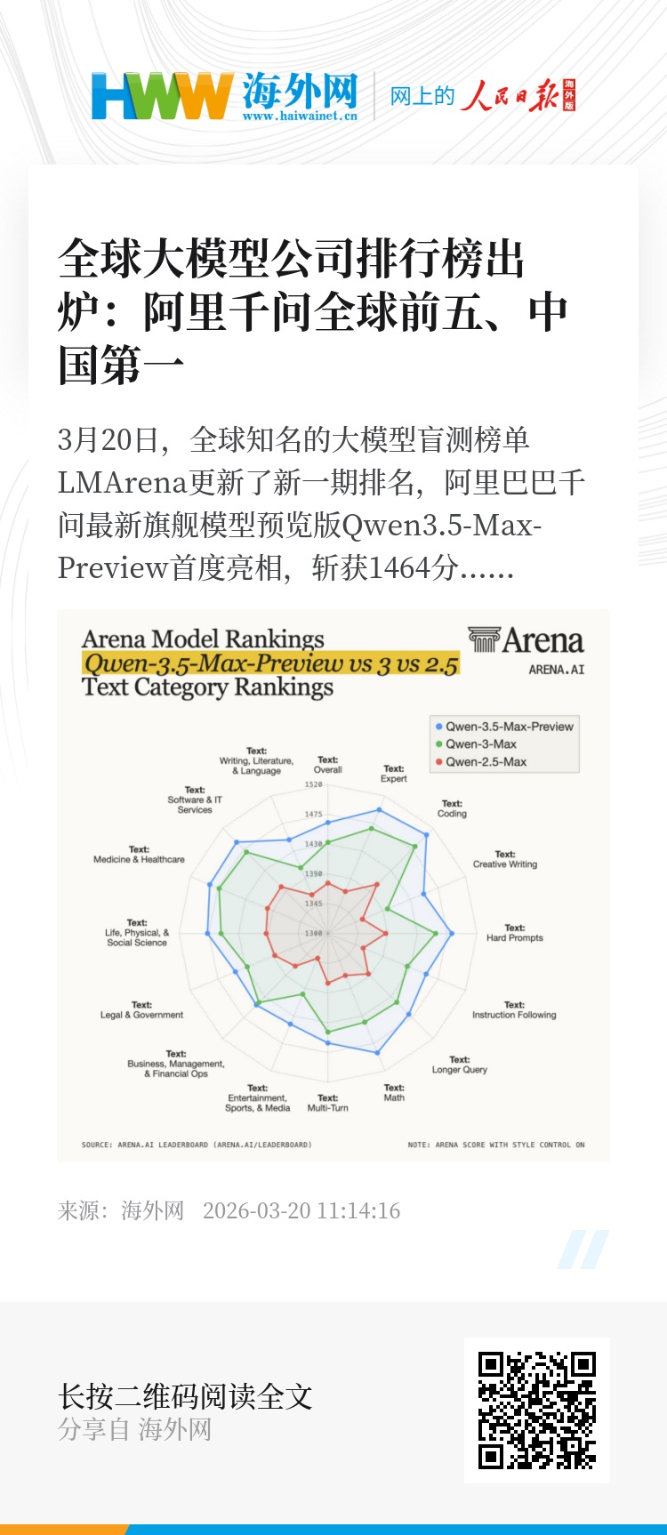 3月20日,全球知名的大模型盲测榜单LMArena更新了新一期排名,阿里巴巴千问最新旗舰模型预览版Qwen3.5-Max-Preview首度亮相,斩获1464分,超过了GPT5.4、Claude4.5、Grok4.1等海外顶级模型,以及豆包2.0、GLM5、Kimi2.5等全部国产模型,千问问鼎中国最强大模型。同时,在LMArena基于模型能力对全球大模型公司排名的榜单中,5家中国公司闯进前十,阿里位列全球前五、中国第一,字节、智谱、月之暗面、百度等闯入全球前十。