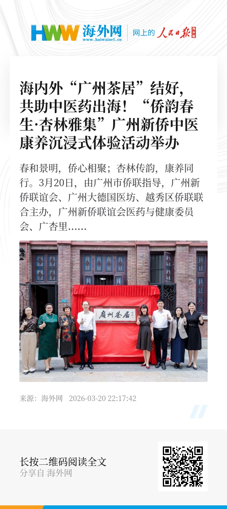 春和景明,侨心相聚;杏林传韵,康养同行。3月20日,由广州市侨联指导,广州新侨联谊会、广州大德国医坊、越秀区侨联联合主办,广州新侨联谊会医药与健康委员会、广杏里健康产业有限公司承办的“侨韵春生・杏林雅集——广州新侨中医康养沉浸式体验活动”在大德国医坊成功举办。