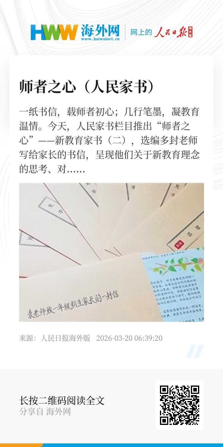 今天,人民家书栏目推出“师者之心”——新教育家书(二),选编多封老师写给家长的书信,呈现他们关于新教育理念的思考、对孩子成长的期待以及对家庭教育方式的真诚建议。