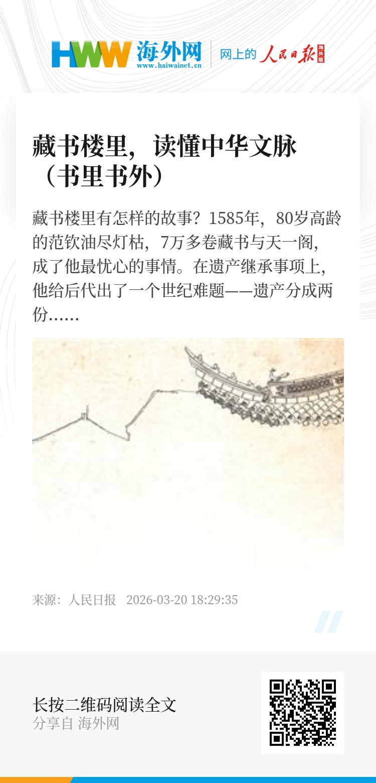静静伫立的书楼,如同载着中华文脉穿越千年的文明方舟。从个人的情怀坚守,到家族的代代相传,再到国家的使命担当,守护文明火种的责任感,在时代变迁中一脉相承。当年轻的读者发现,古老的文字可以变得新潮有趣,先辈的智慧仍能启迪当下生活,那种从血脉里生出的自豪感与认同感,正是这艘文明方舟行稳致远的底气,也是我们文化自信坚实的根基。(鲁青)