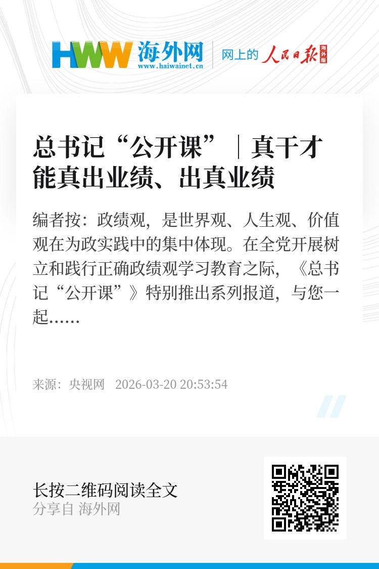 编者按:政绩观,是世界观、人生观、价值观在为政实践中的集中体现。在全党开展树立和践行正确政绩观学习教育之际,央视网《总书记“公开课”》特别推出系列报道,与您一起从总书记的“知”与“行”中感悟正确政绩观。
