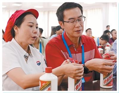 采访团成员(右)在茅台车间学习系酒瓶丝带。