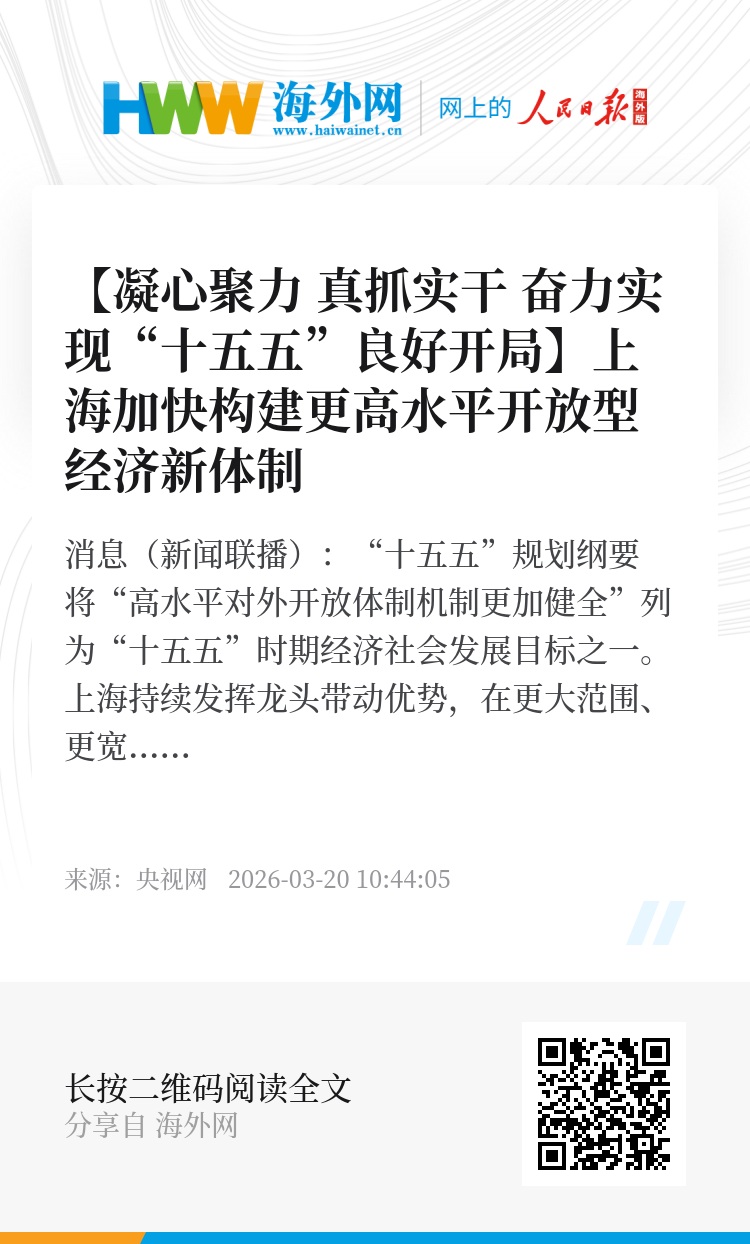 央视网消息(新闻联播):“十五五”规划纲要将“高水平对外开放体制机制更加健全”列为“十五五”时期经济社会发展目标之一。上海持续发挥龙头带动优势,在更大范围、更宽领域、更深层次推进高水平对外开放,推动高质量发展。