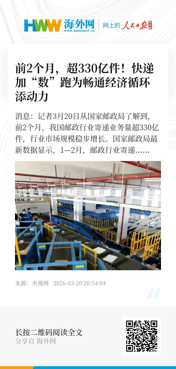 央视网消息:记者3月20日从国家邮政局了解到,前2个月,我国邮政行业寄递业务量超330亿件,行业市场规模稳步增长。