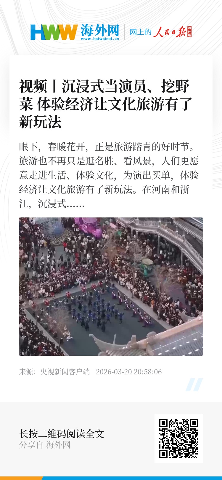 眼下,春暖花开,正是旅游踏青的好时节。旅游也不再只是逛名胜、看风景,人们更愿意走进生活、体验文化,为演出买单,体验经济让文化旅游有了新玩法。在河南和浙江,沉浸式演出正推动文旅产业由单一门票经济向体验经济转型。