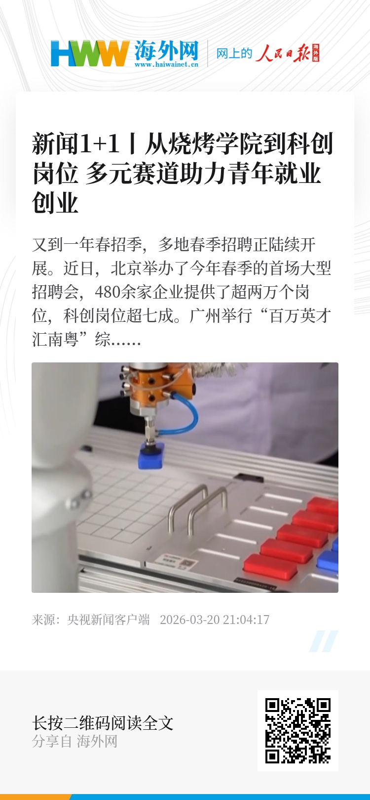 又到一年春招季,多地春季招聘正陆续开展。近日,北京举办了今年春季的首场大型招聘会,480余家企业提供了超两万个岗位,科创岗位超七成。广州举行“百万英才汇南粤”综合招聘会,近2000家头部单位提供超过8.5万个岗位。此外,全国首创湖南岳阳烧烤学院正式启动,对从业者和产业给予双重赋能。今年1270万高校毕业生如何高质量就业?技能培训如何照亮就业前程?《新闻1+1》本期关注:青年就业创业,如何“稳得住”?