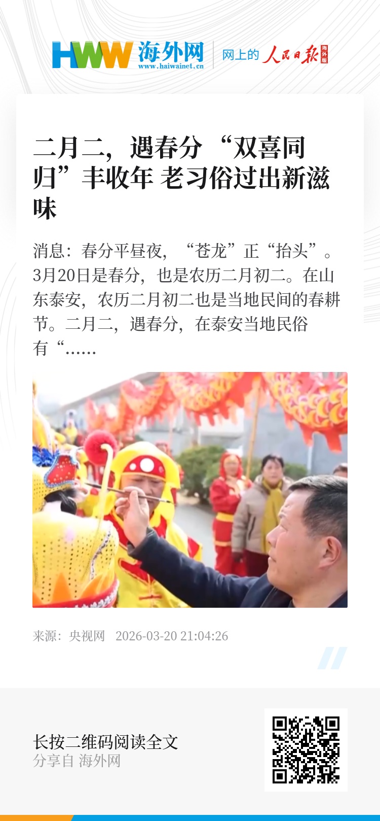 央视网消息:春分平昼夜,“苍龙”正“抬头”。3月20日是春分,也是农历二月初二。在山东泰安,农历二月初二也是当地民间的春耕节。二月二,遇春分,在泰安当地民俗有“双喜同归”丰收年的说法。在泰安岱岳区,20多个民俗活动汇聚成一场民俗大巡游,祈求风调雨顺、五谷丰登。