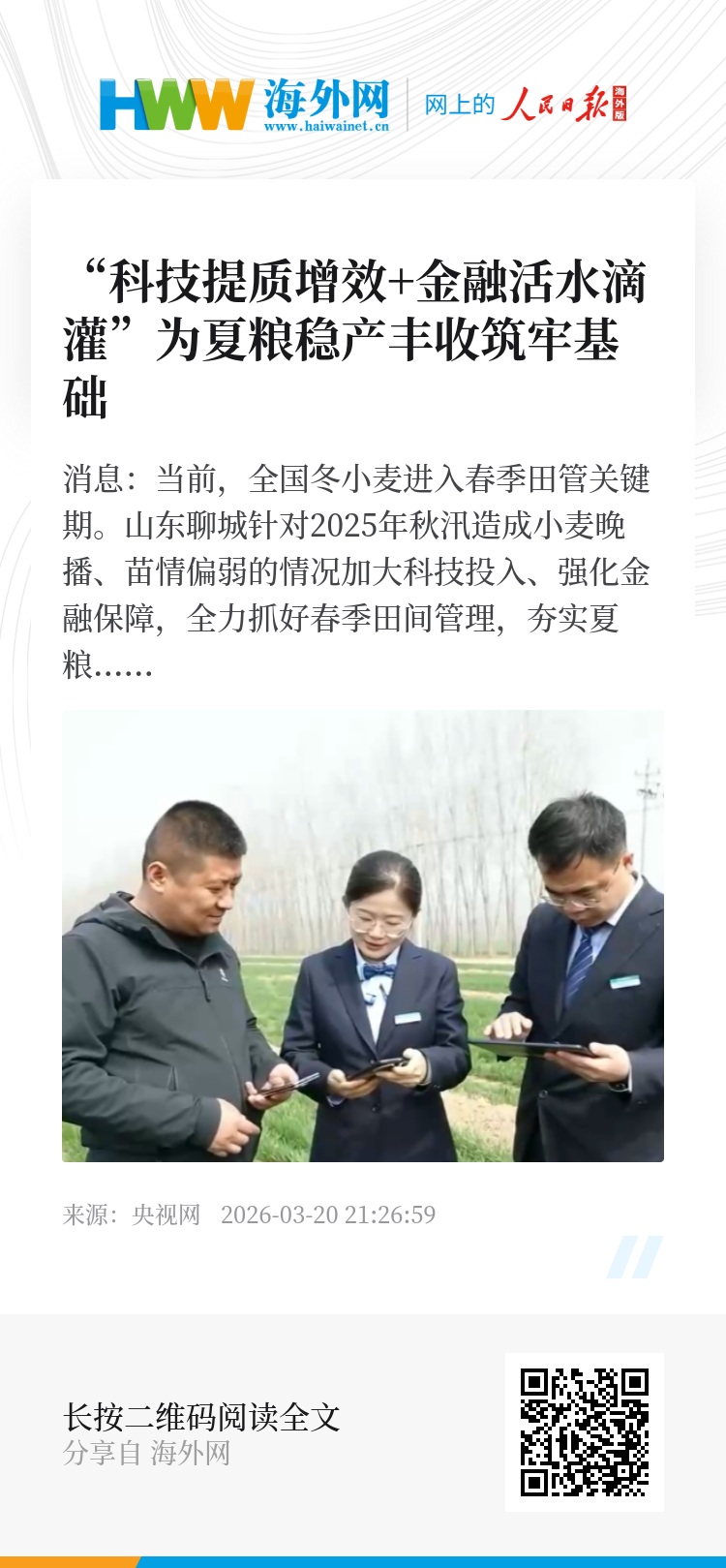 目前,聊城超百万亩冬小麦春管工作正高效推进,通过科技赋能与金融保障双向发力,为夏粮稳产丰收筑牢坚实基础。