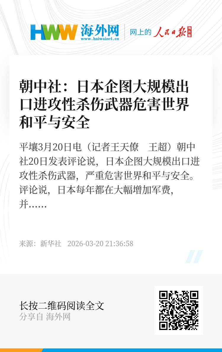 新华社平壤3月20日电(记者王天僚 王超)朝中社20日发表评论说,日本企图大规模出口进攻性杀伤武器,严重危害世界和平与安全。