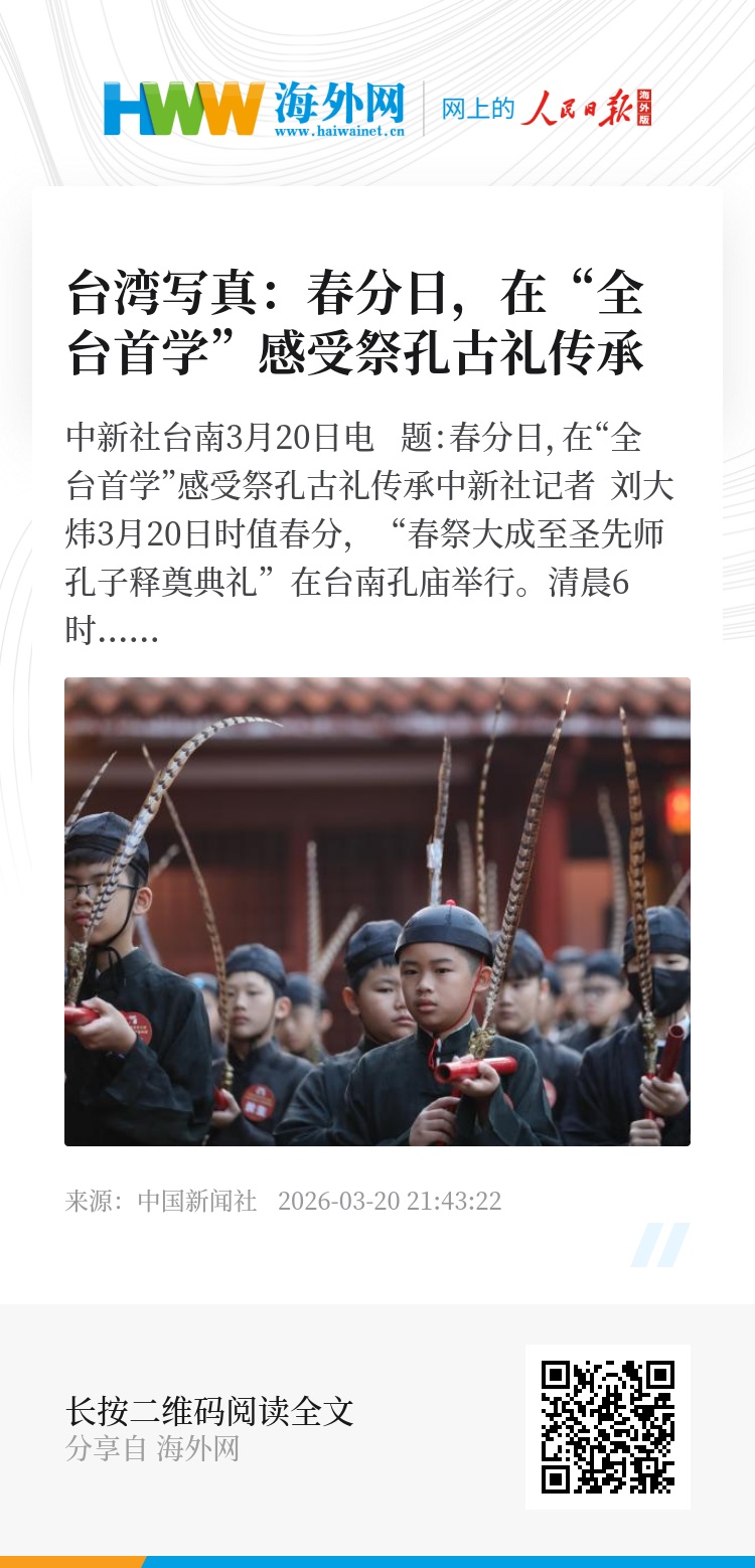 中新社台南3月20日电 题:春分日,在“全台首学”感受祭孔古礼传承
