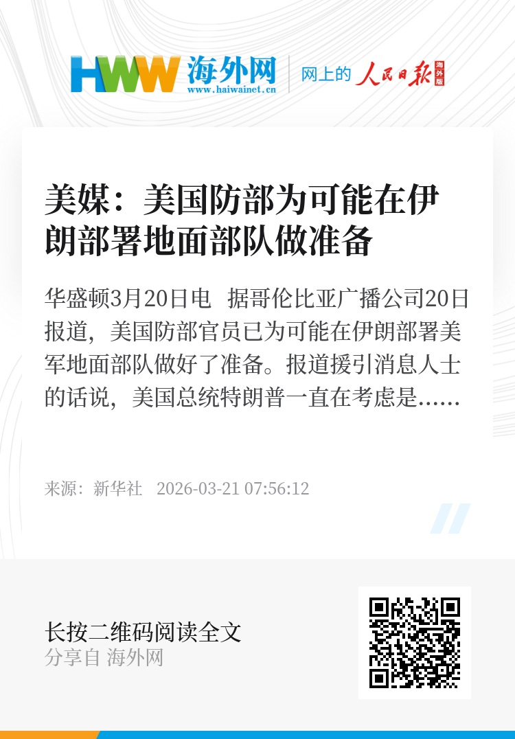 新华社华盛顿3月20日电 据哥伦比亚广播公司20日报道,美国防部官员已为可能在伊朗部署美军地面部队做好了准备。