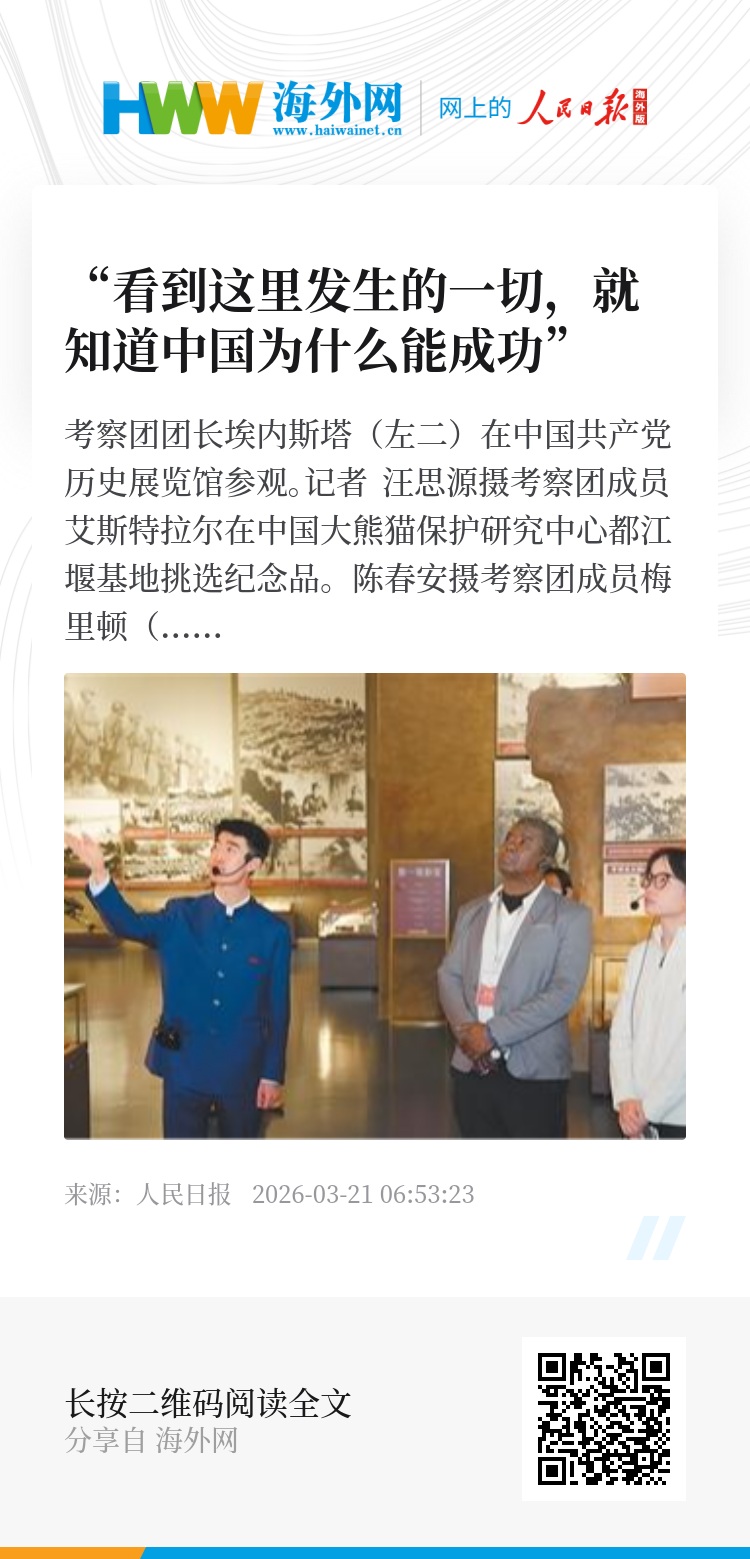 “一走进中国共产党历史展览馆序厅,我就被漆壁画《长城颂》震撼到。中国是一个重视历史的国家。”埃斯特尔说,在参观中,五四运动、长征、中国人民抗日战争等历史场景仿佛展现在他眼前,“历史让我们知道从哪里来、到哪里去”。他说,中国以人民为中心的发展思想引人共鸣,联合塞舌尔党党部所在地就叫“人民之家”,该党也致力于为人民创造美好生活。