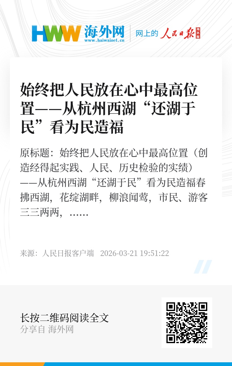 “还湖于民”的故事,在西湖之畔口口相传。始终把人民放在心中最高位置,树立和践行正确政绩观,是新征程上每一名党员干部的必修课。