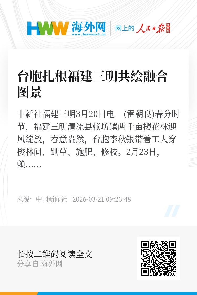 中新社福建三明3月20日电 (雷朝良)春分时节,福建三明清流县赖坊镇两千亩樱花林迎风绽放,春意盎然,台胞李秋银带着工人穿梭林间,锄草、施肥、修枝。