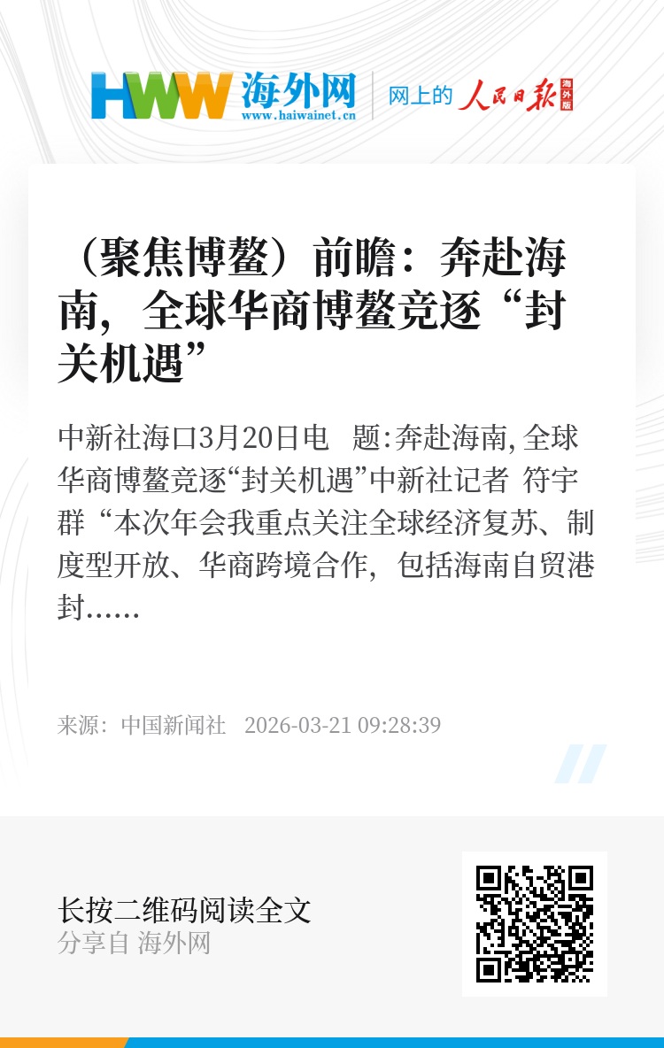 博鳌亚洲论坛2026年年会将于本月24日至27日在海南博鳌举行,论坛华商领袖与华人智库圆桌会议和海南自贸港封关机遇备受全球华商关注,期待共谋合作、探寻商机。