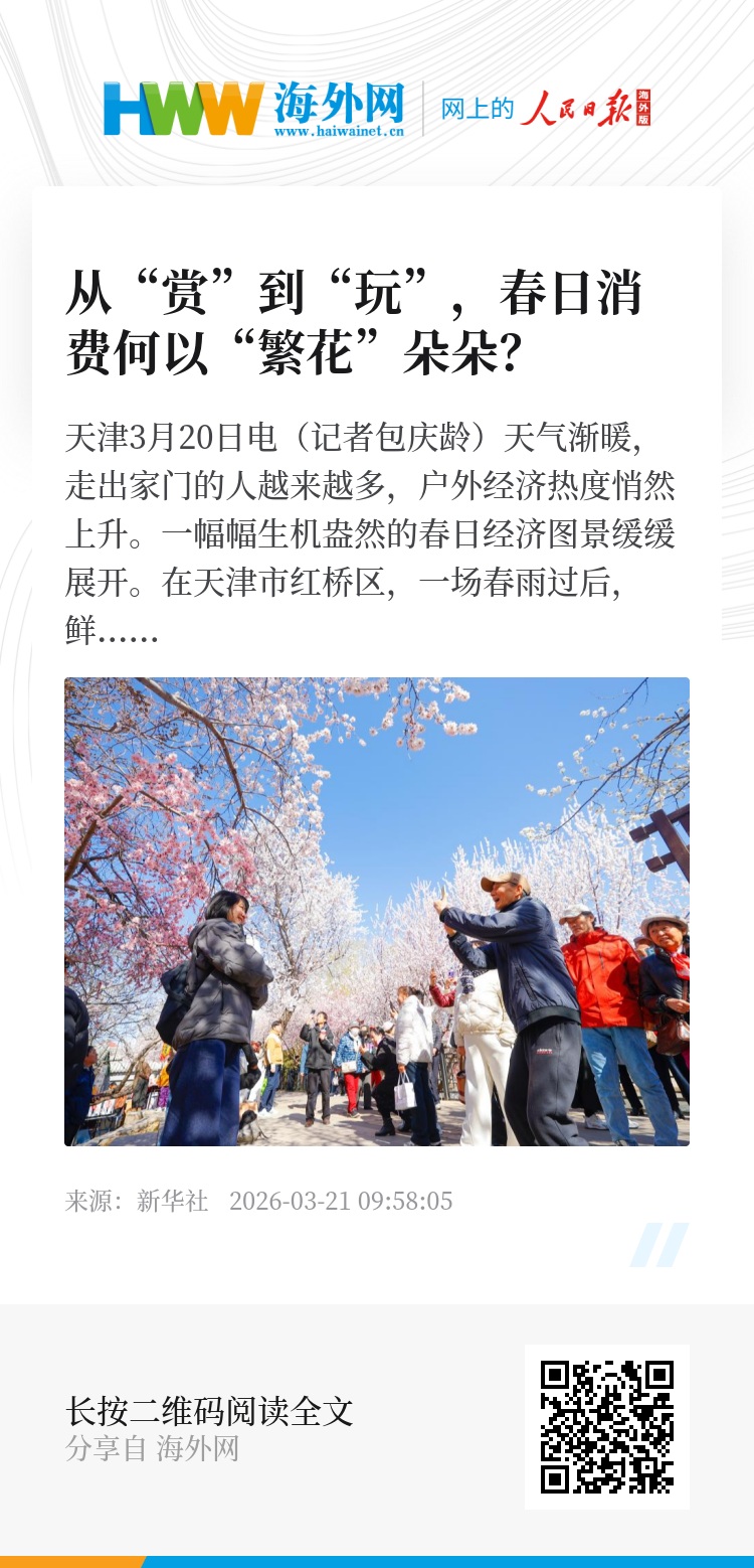 新华社天津3月20日电(记者包庆龄)天气渐暖,走出家门的人越来越多,户外经济热度悄然上升。一幅幅生机盎然的春日经济图景缓缓展开。
