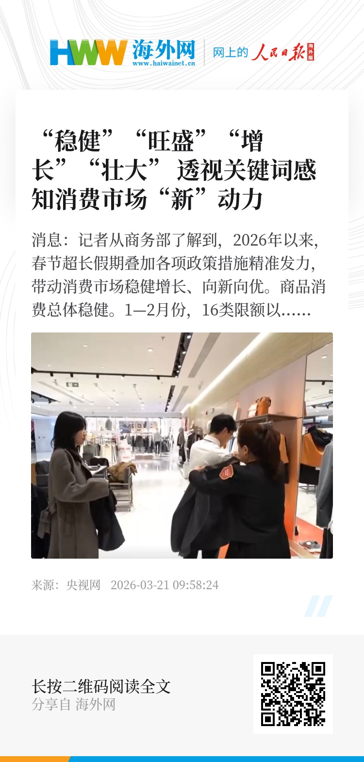 央视网消息:记者从商务部了解到,2026年以来,春节超长假期叠加各项政策措施精准发力,带动消费市场稳健增长、向新向优。