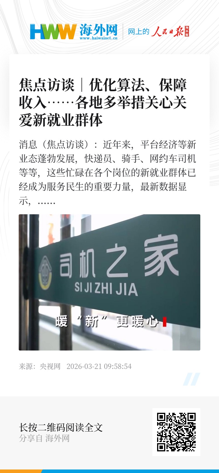 央视网消息(焦点访谈):近年来,平台经济等新业态蓬勃发展,快递员、骑手、网约车司机等等,这些忙碌在各个岗位的新就业群体已经成为服务民生的重要力量,最新数据显示,我国新就业群体人数已经达到了8400万人。如何让新就业群体在外打拼更有底气、更有归属感?各级政府推出了一系列举措,加强他们的权益保障,帮助构建和谐劳动关系。这些劳动者用辛勤付出守护城市运转,同时也被关心、被温暖,他们正一步步融入城市,成为共建美好家园的新生力量。
