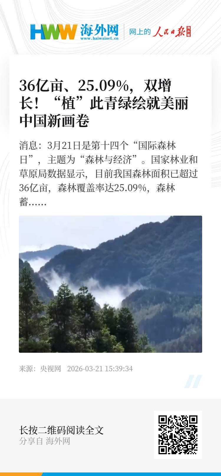 央视网消息:3月21日是第十四个“国际森林日”,主题为“森林与经济”。国家林业和草原局数据显示,目前我国森林面积已超过36亿亩,森林覆盖率达25.09%,森林蓄积量达209.88亿立方米,森林面积和森林蓄积连续40年实现“双增长”。中国以全球领先的增绿速度与规模,正为世界贡献一个不断生长的“绿色奇迹”。