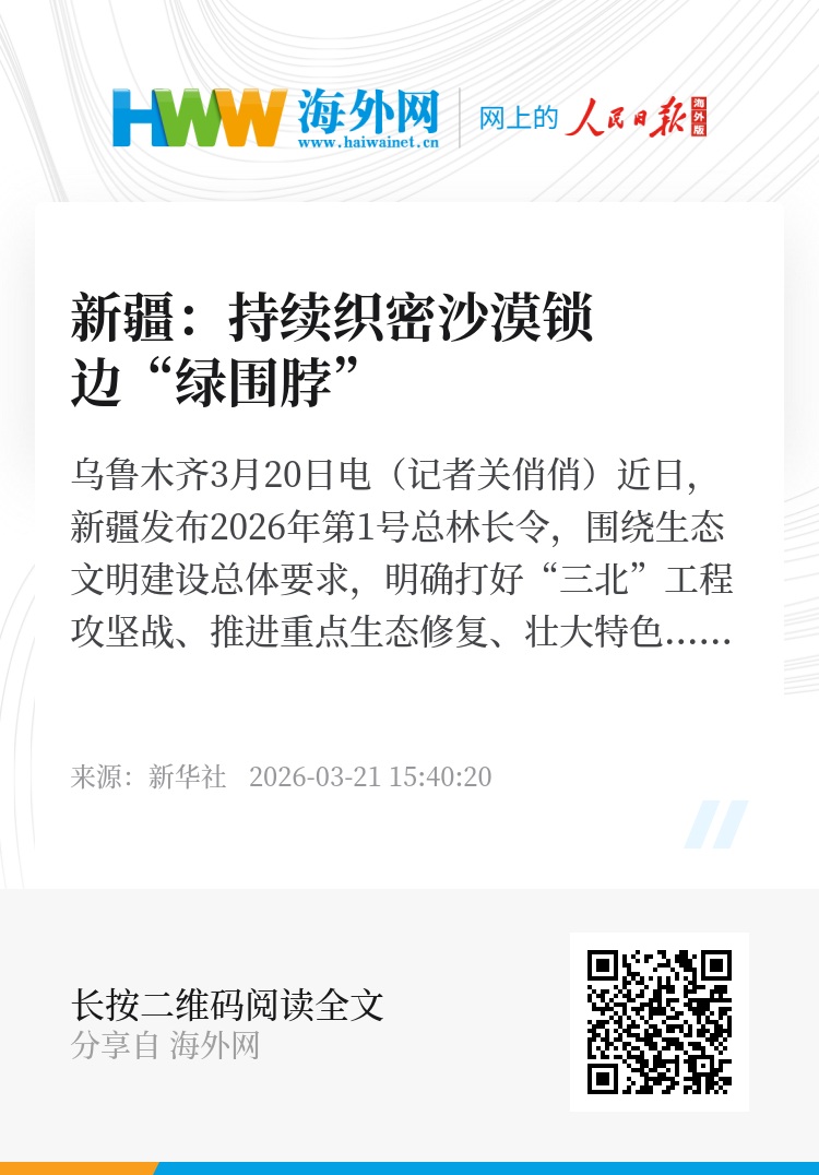 新华社乌鲁木齐3月20日电(记者关俏俏)近日,新疆发布2026年第1号总林长令,围绕生态文明建设总体要求,明确打好“三北”工程攻坚战、推进重点生态修复、壮大特色林草产业、完善自然保护地体系、强化资源监管、抓实灾害防控六大重点任务,统筹推进新疆林草事业高质量发展。