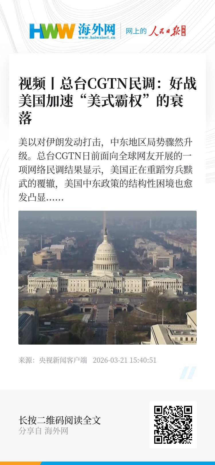 美以对伊朗发动打击,中东地区局势骤然升级。总台CGTN日前面向全球网友开展的一项网络民调结果显示,美国正在重蹈穷兵黩武的覆辙,美国中东政策的结构性困境也愈发凸显,“美式霸权”正在快速衰落。