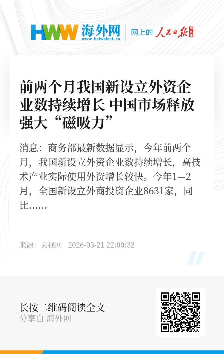 央视网消息:商务部最新数据显示,今年前两个月,我国新设立外资企业数持续增长,高技术产业实际使用外资增长较快。