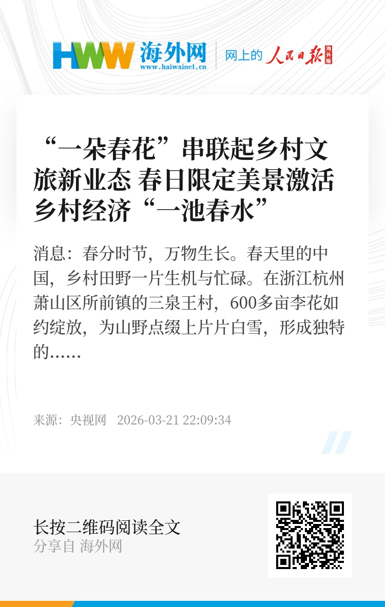 央视网消息:春分时节,万物生长。春天里的中国,乡村田野一片生机与忙碌。在浙江杭州萧山区所前镇的三泉王村,600多亩李花如约绽放,为山野点缀上片片白雪,形成独特的“南国香雪”胜景,不少市民游客慕名而来,踏春赏花。