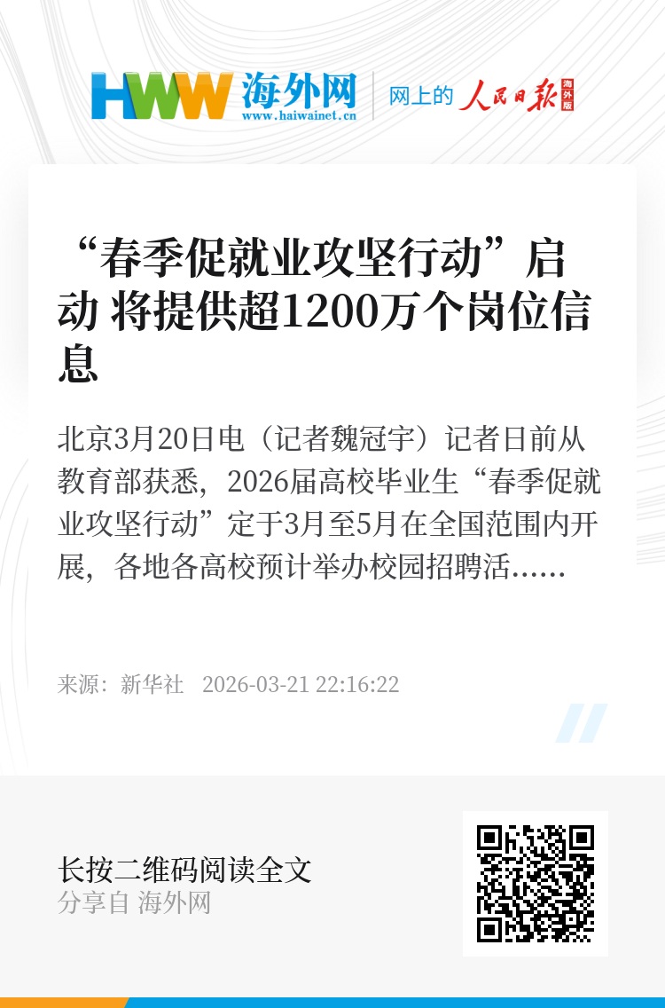 新华社北京3月20日电(记者魏冠宇)记者日前从教育部获悉,2026届高校毕业生“春季促就业攻坚行动”定于3月至5月在全国范围内开展,各地各高校预计举办校园招聘活动1.1万余场,提供岗位信息超1200万个。