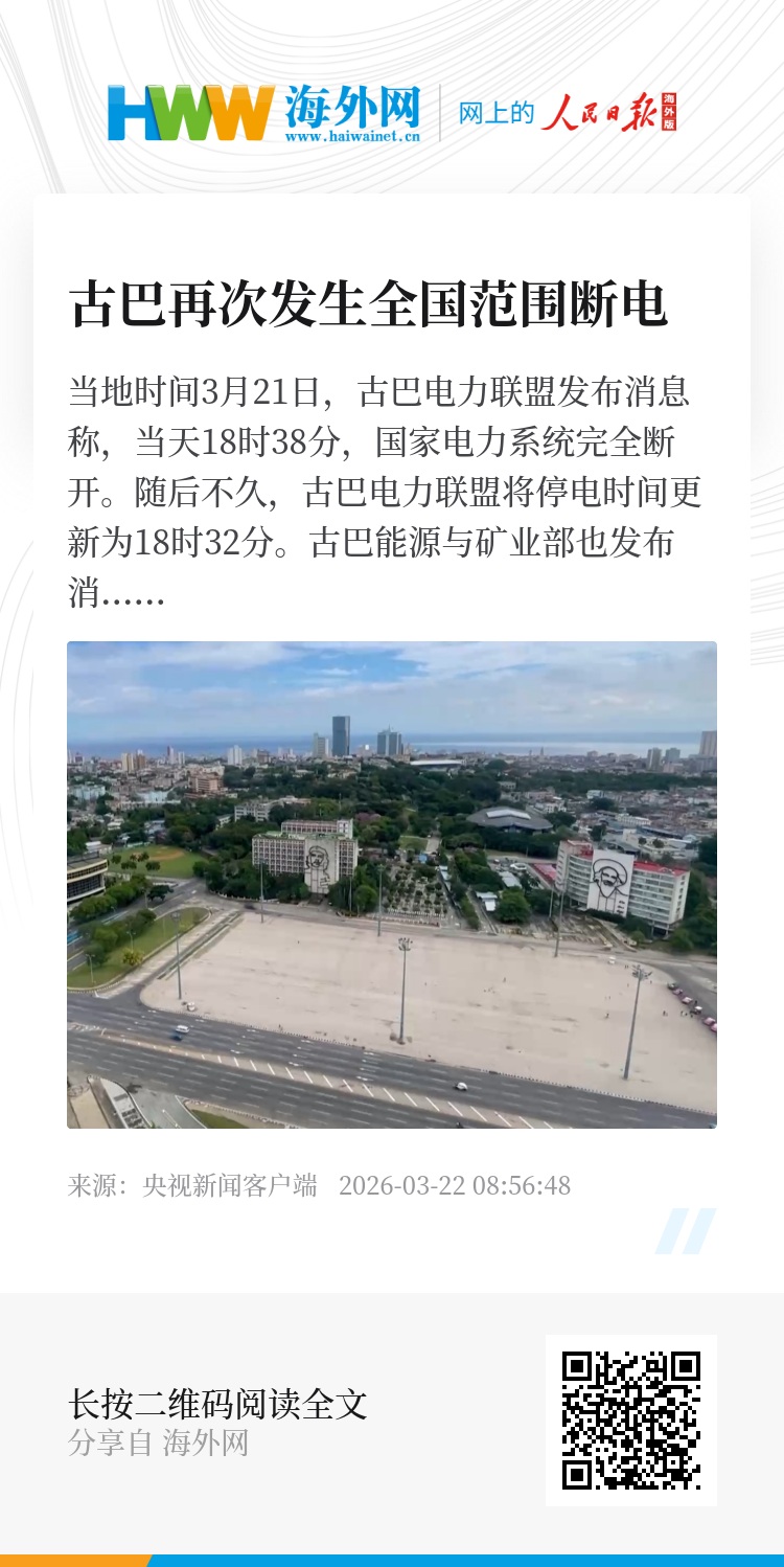 当地时间3月21日,古巴电力联盟发布消息称,当天18时38分,国家电力系统完全断开。随后不久,古巴电力联盟将停电时间更新为18时32分。