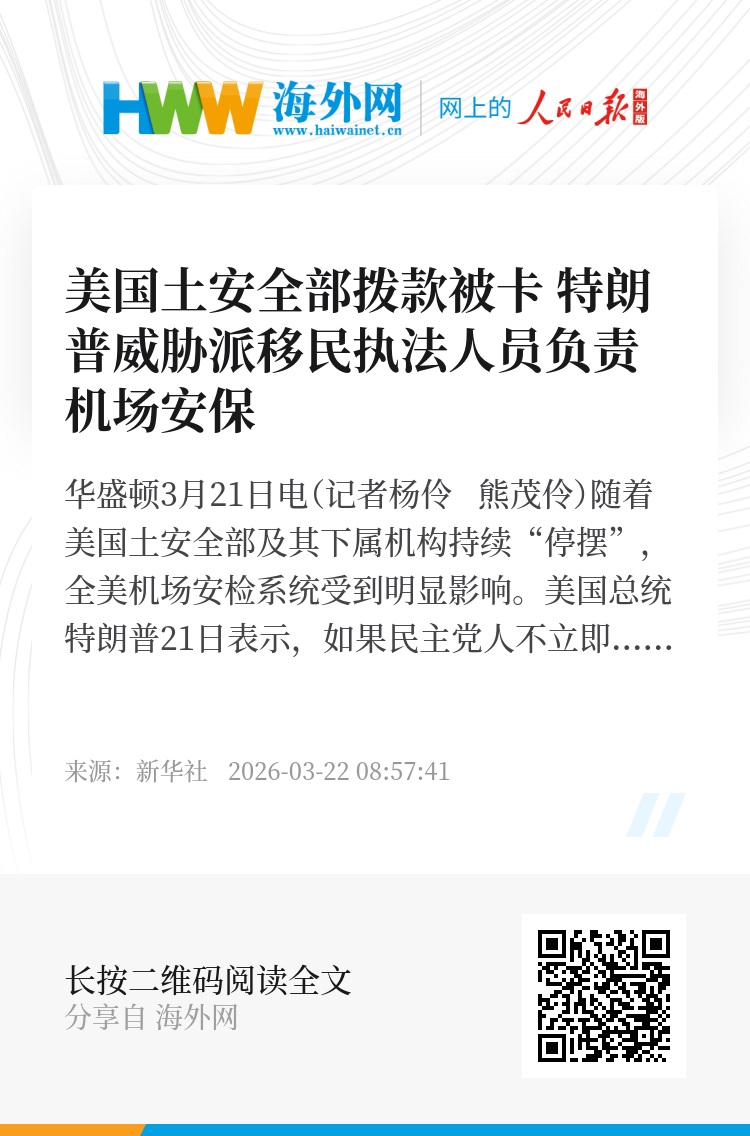 新华社华盛顿3月21日电(记者杨伶 熊茂伶)随着美国土安全部及其下属机构持续“停摆”,全美机场安检系统受到明显影响。美国总统特朗普21日表示,如果民主党人不立即就国土安全部拨款达成协议,他将派遣移民与海关执法局人员负责机场安保。