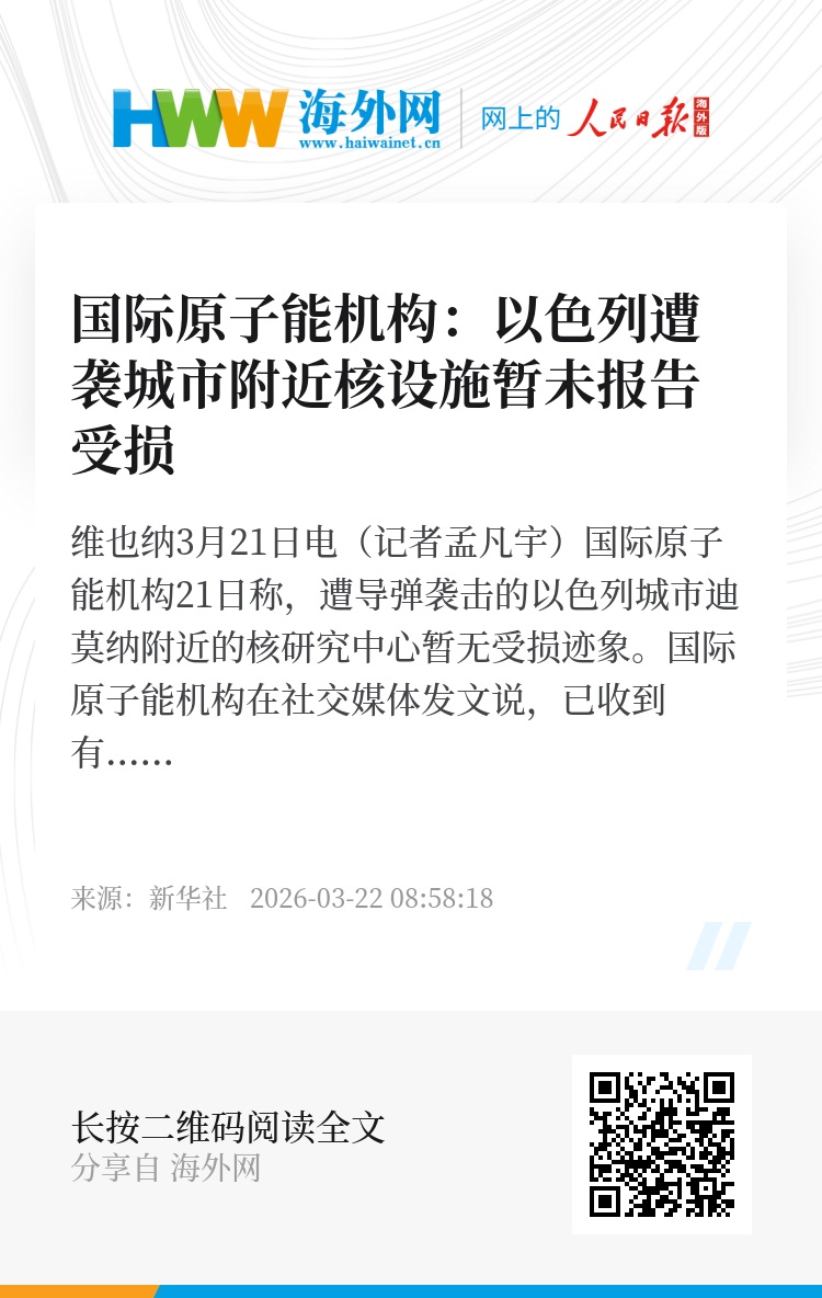 新华社维也纳3月21日电(记者孟凡宇)国际原子能机构21日称,遭导弹袭击的以色列城市迪莫纳附近的核研究中心暂无受损迹象。