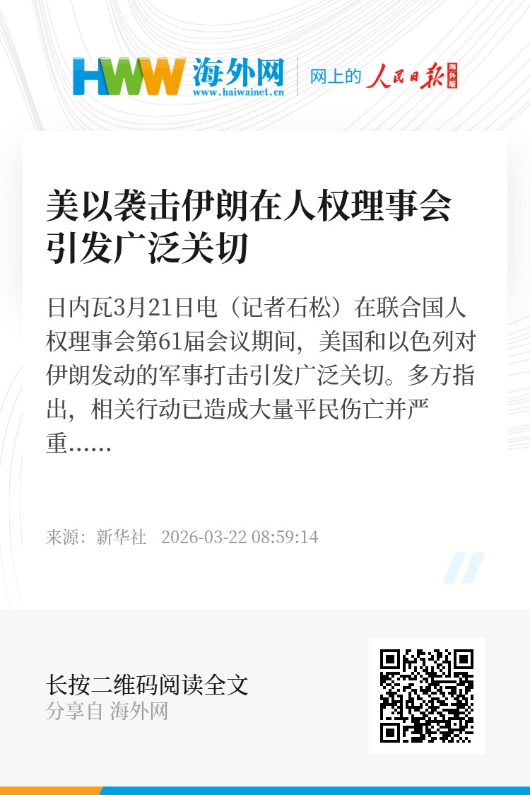 新华社日内瓦3月21日电(记者石松)在联合国人权理事会第61届会议期间,美国和以色列对伊朗发动的军事打击引发广泛关切。多方指出,相关行动已造成大量平民伤亡并严重破坏民用基础设施,对地区安全与人道局势产生负面影响。
