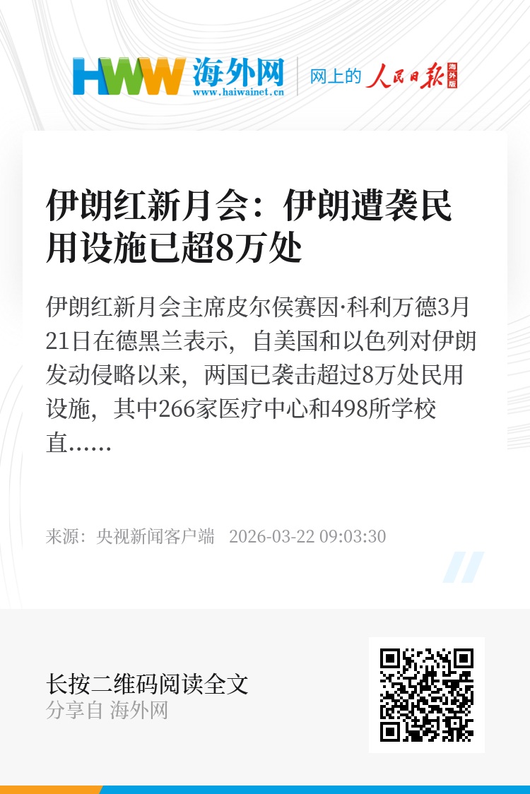 伊朗红新月会主席皮尔侯赛因·科利万德3月21日在德黑兰表示,自美国和以色列对伊朗发动侵略以来,两国已袭击超过8万处民用设施,其中266家医疗中心和498所学校直接或间接受到攻击。
