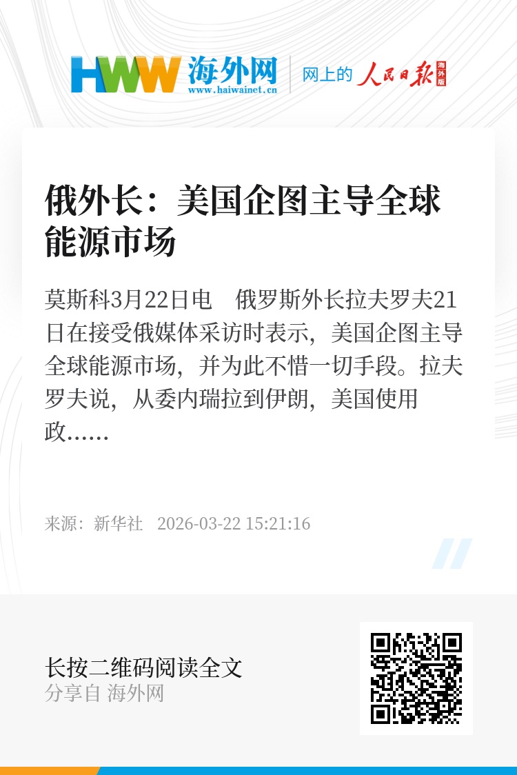 新华社莫斯科3月22日电 俄罗斯外长拉夫罗夫21日在接受俄媒体采访时表示,美国企图主导全球能源市场,并为此不惜一切手段。