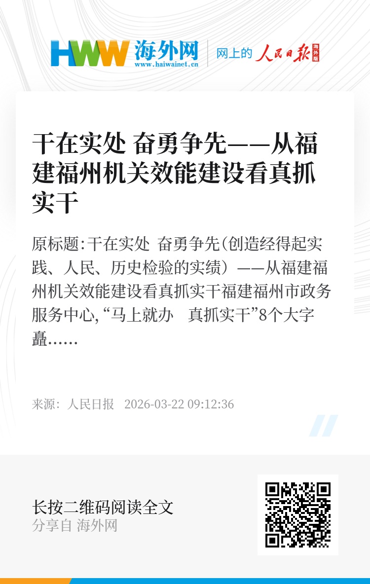 作风正则人心顺,作风好则事业兴。正确的政绩观,不在口号里,而在一件件办成的实事里。如今,福州市深入开展“深学争优、敢为争先、实干争效”、持续推进“奋勇争先”行动,“马上就办、真抓实干”不断内化为广大党员干部的自觉行动,为推动经济社会高质量发展蓄积起澎湃动力。(本报记者 孟祥夫 刘晓宇)