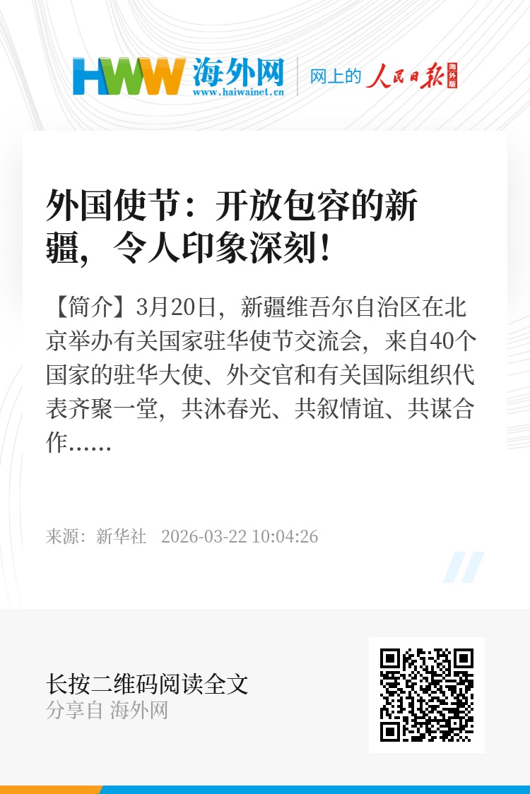 【简介】3月20日,新疆维吾尔自治区在北京举办有关国家驻华使节交流会,来自40个国家的驻华大使、外交官和有关国际组织代表齐聚一堂,共沐春光、共叙情谊、共谋合作。