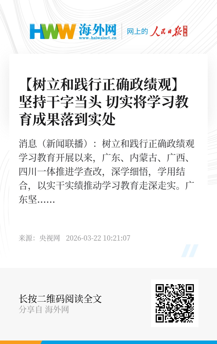 央视网消息(新闻联播):树立和践行正确政绩观学习教育开展以来,广东、内蒙古、广西、四川一体推进学查改,深学细悟,学用结合,以实干实绩推动学习教育走深走实。