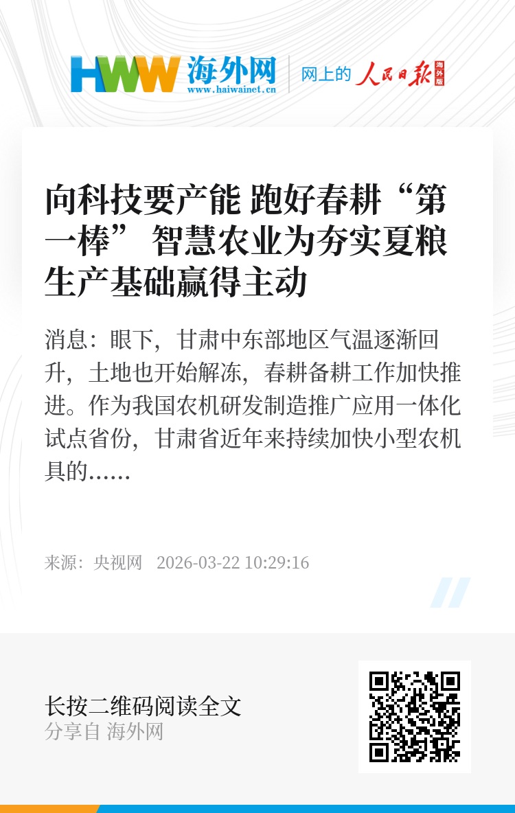 央视网消息:眼下,甘肃中东部地区气温逐渐回升,土地也开始解冻,春耕备耕工作加快推进。作为我国农机研发制造推广应用一体化试点省份,甘肃省近年来持续加快小型农机具的研发制造和应用推广,丘陵山区农业机械化水平不断提高,今年将有500多台新研发的农机在春耕一线接受“考验”。